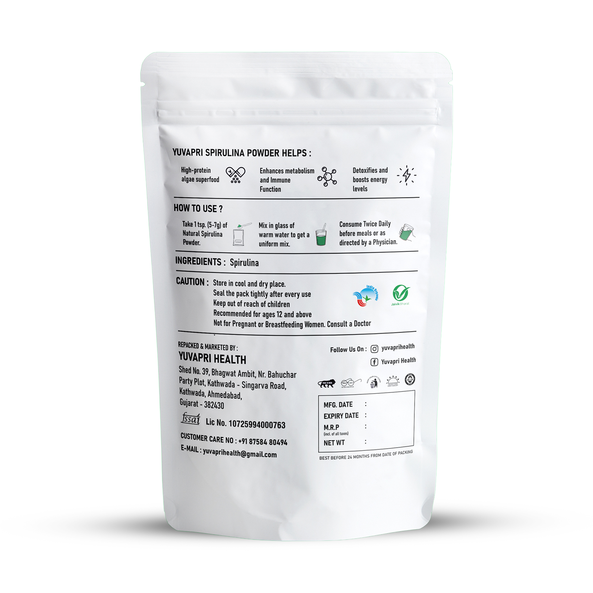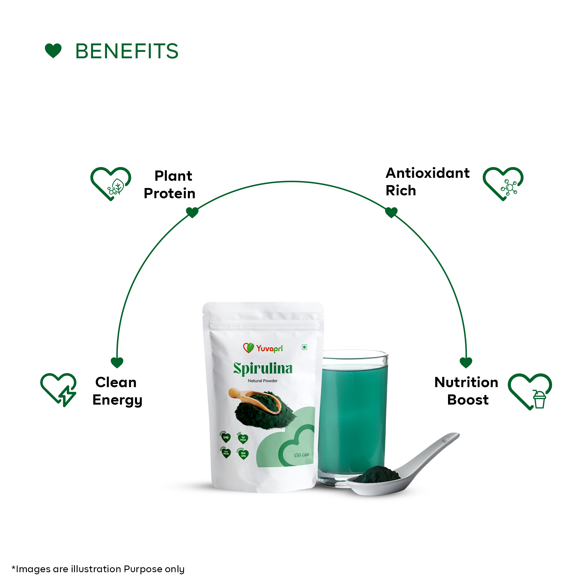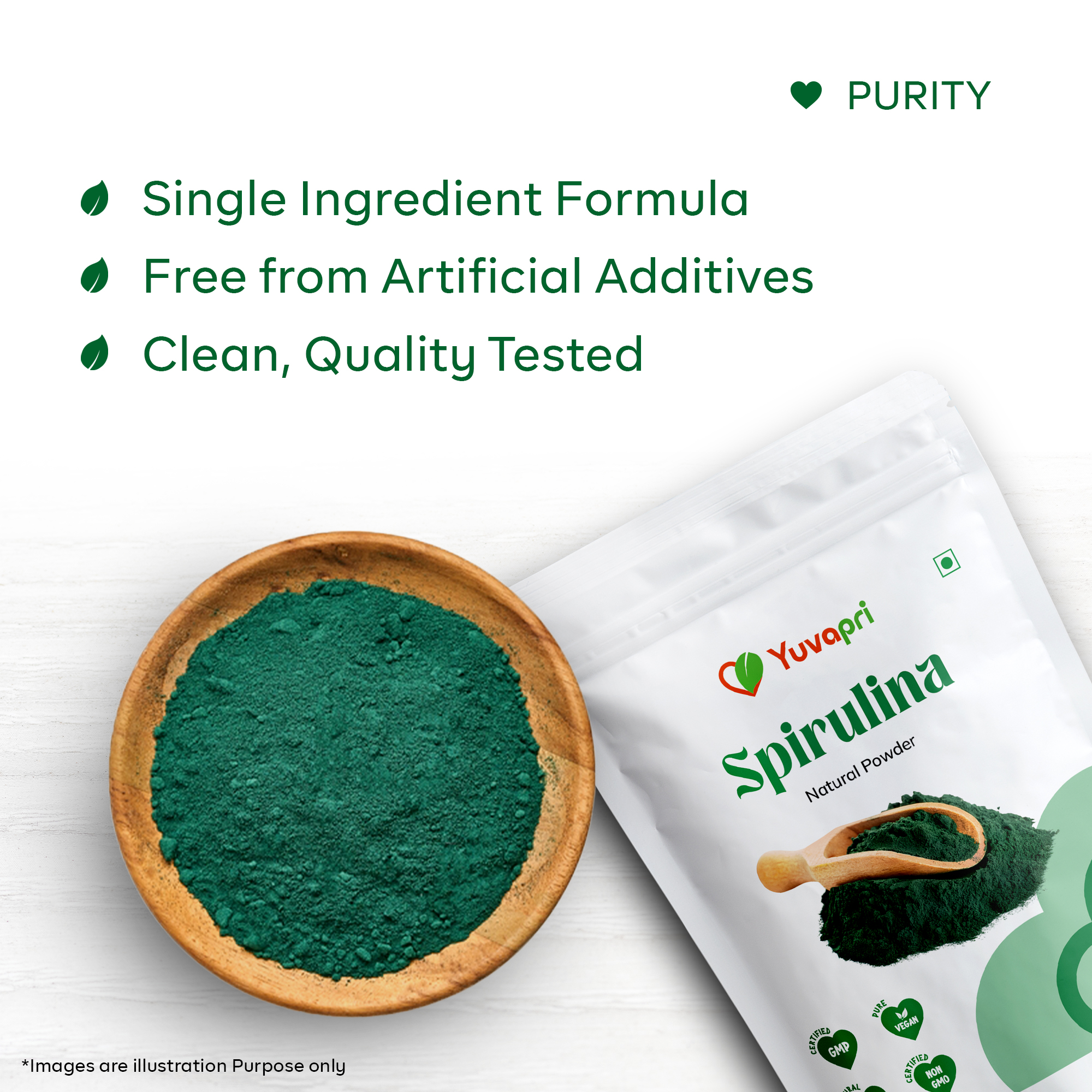 Yuvapri Spirulina Powder is a nutrient-dense blue-green algae superfood known for its exceptionally high protein content and powerful antioxidant profile. Carefully processed to maintain purity and potency, it provides natural support for immunity, detoxification, stamina, and overall vitality.